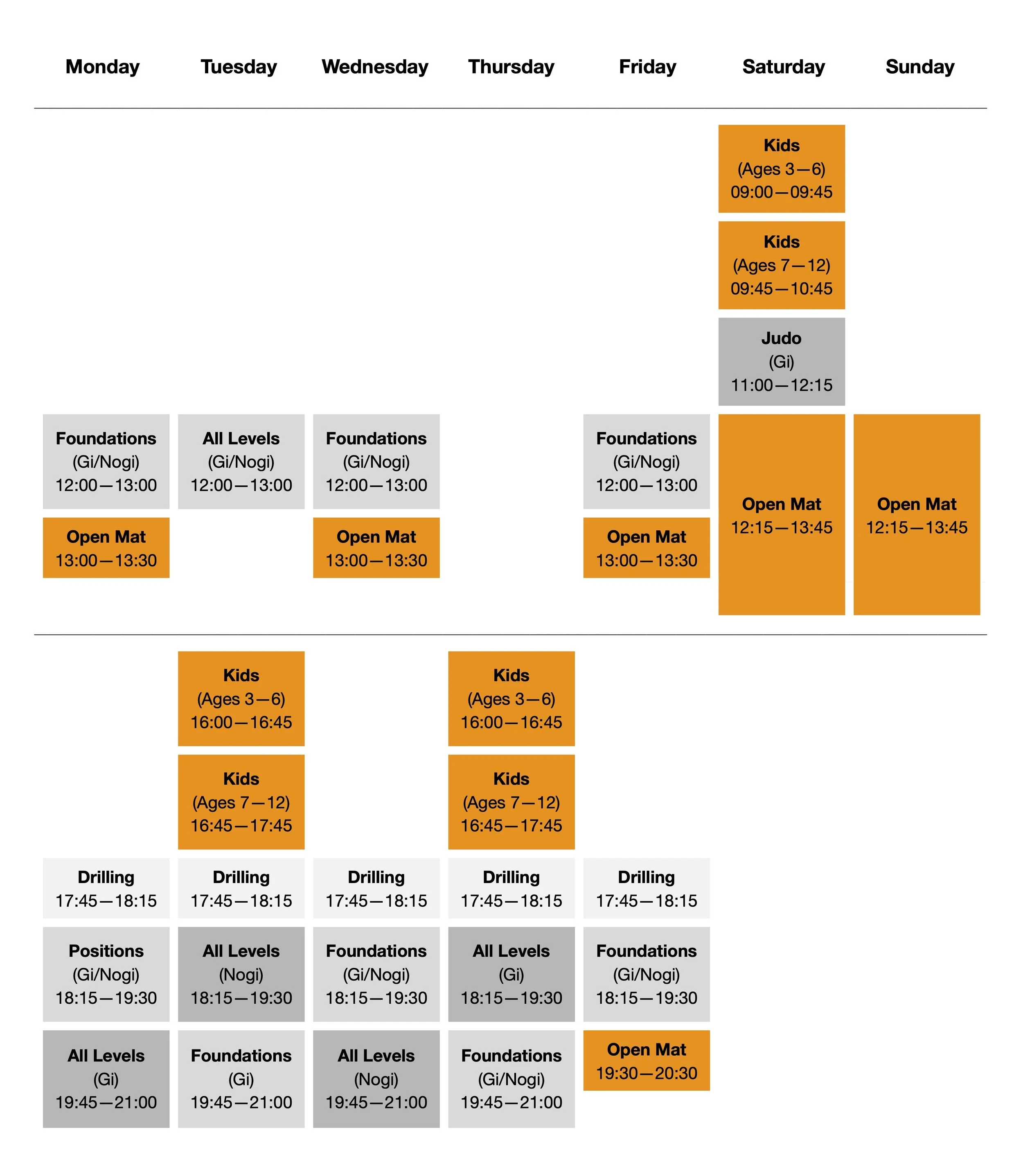 During the slots marked Drilling, the mats are available to use for practicing techniques, sparring, or anything you’d like—just make sure you have a drilling partner ready to practice with!